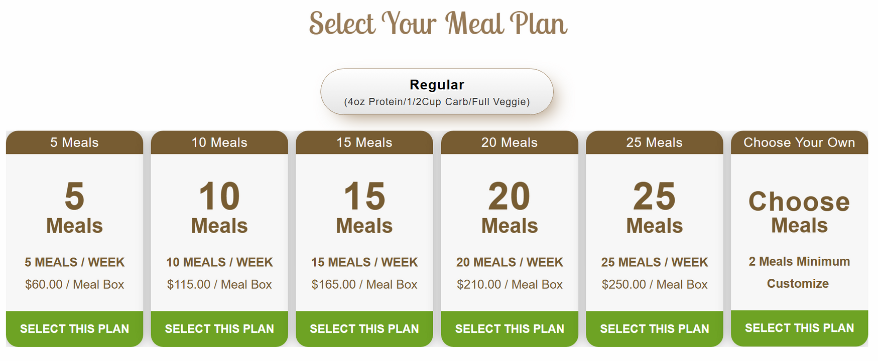 Offering 5 standard meal plan options from 5-25 meals per week. You order these meals as listed. Then the Choose Your Own plan starts at a minimum of 2 meals, and you have some ability to customize the meals and do whatever quantity.
