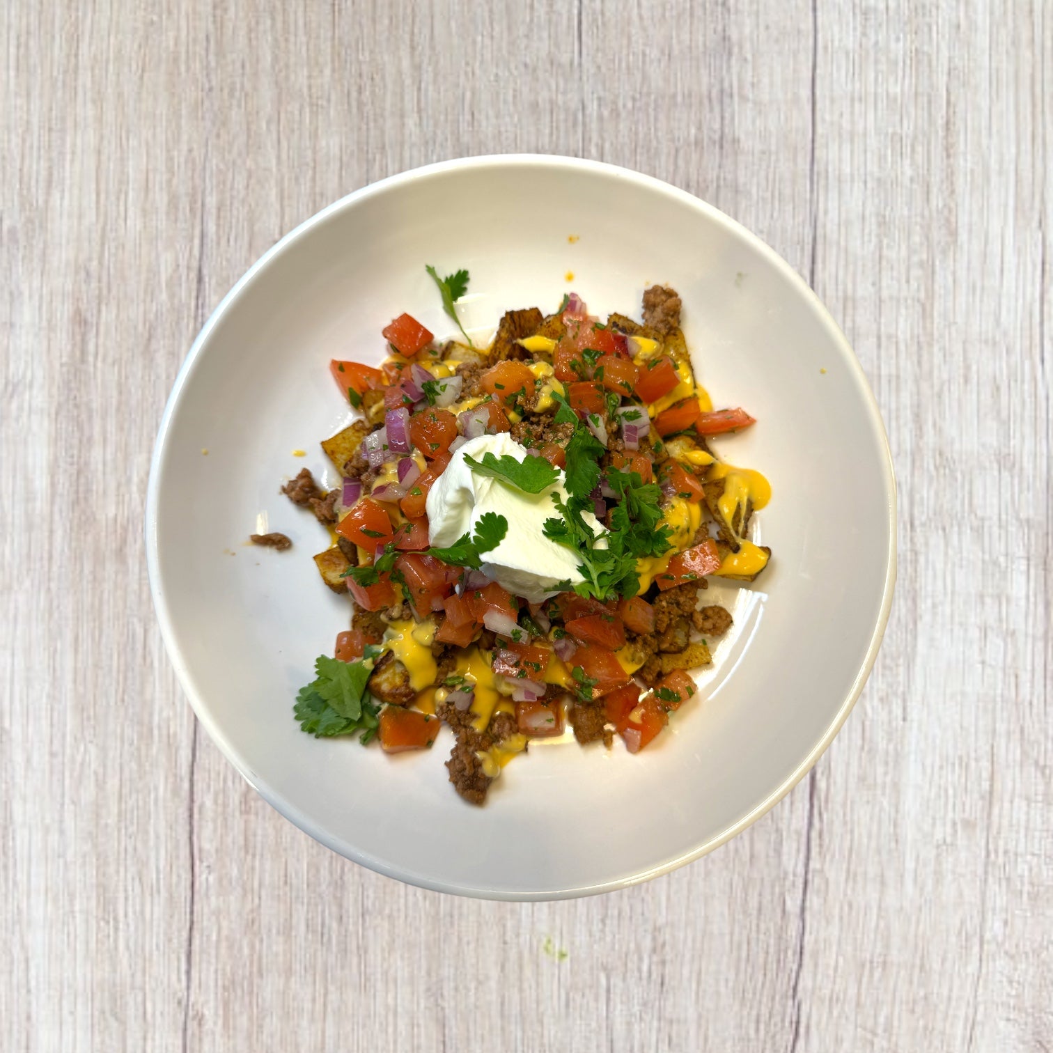 Ingredients: Ground Beef, Cilantro, Potatoes, Tomatoes, Red Onion, Lime, Paprika, Cumin, Oregano, Cayenne Pepper, Tomato Paste, Olive Oil, Salt, Pepper, Milk, Cheddar Cheese, Monterrey Jack Cheese, Butter, Sour Cream Chili Powder, Garlic Powder